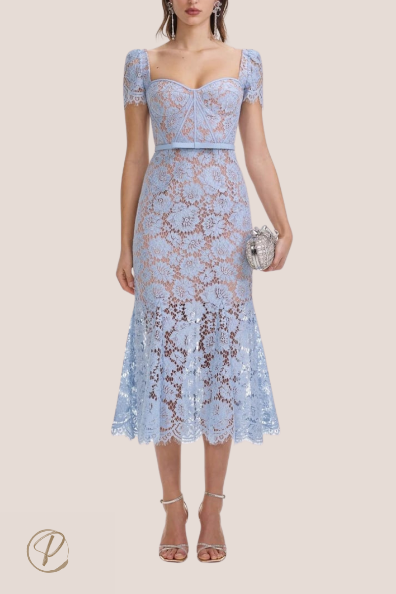 Kuplu Mavi Midi Dantel Tasarım Elbise